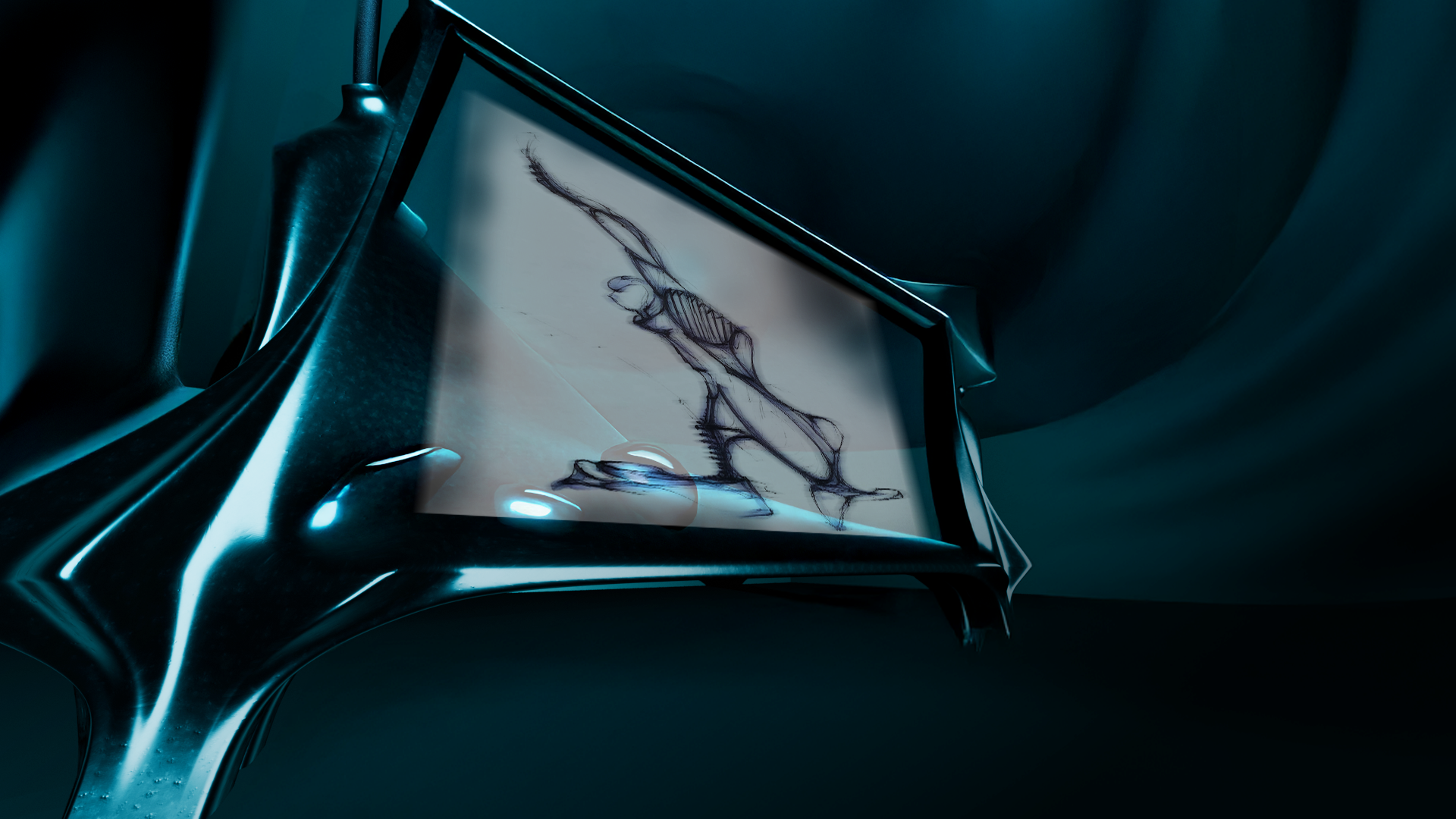 • Inside the OMXPLORE lab, Ataraxia is fueled by aura drawn from everywhere. The result is in process: mucus bursts from its constant growth, sweating under the strain of its heavy internal mechanics. On the digital screen, a sketch from its user, CSX27, ensures its reflection and evolution remain true as it continues to grow…